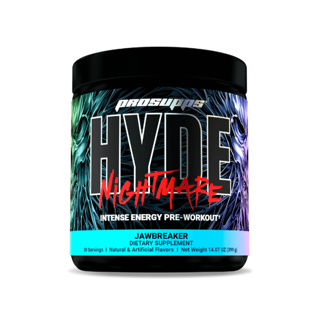 ProSupps HYDE Nightmare is an intense pre-workout powder formulated for high-performance athletes. It contains a blend of clinically researched ingredients like caffeine, creatine, beta-alanine, and L-citrulline to boost energy, focus, and athletic performance. The Jawbreaker flavor is one of the available options for this pre-workout supplement. It is tested for banned substances and registered with the Informed Choice program. Users report experiencing a significant energy boost and improved workout performance when taking HYDE Nightmare.
